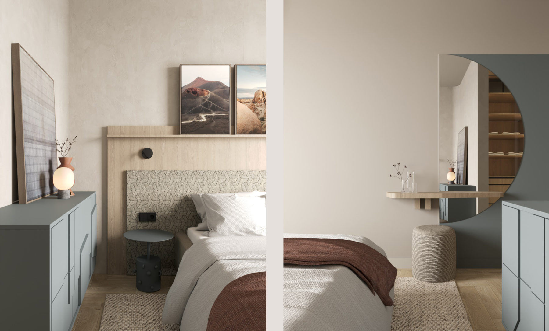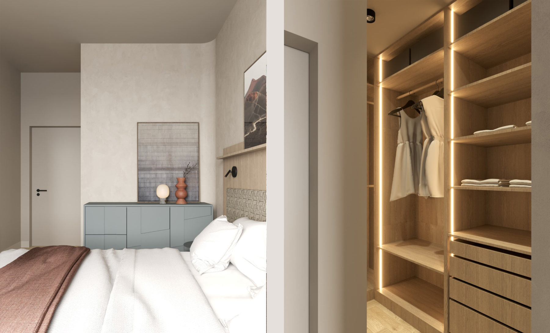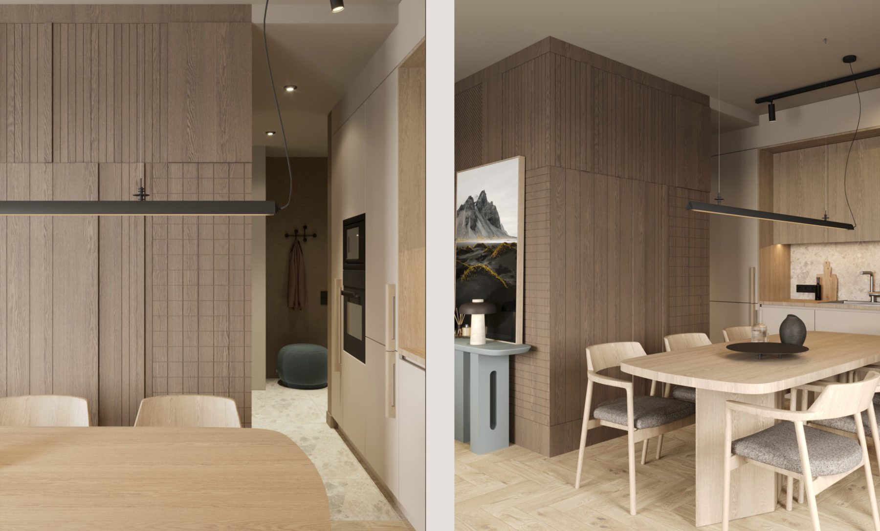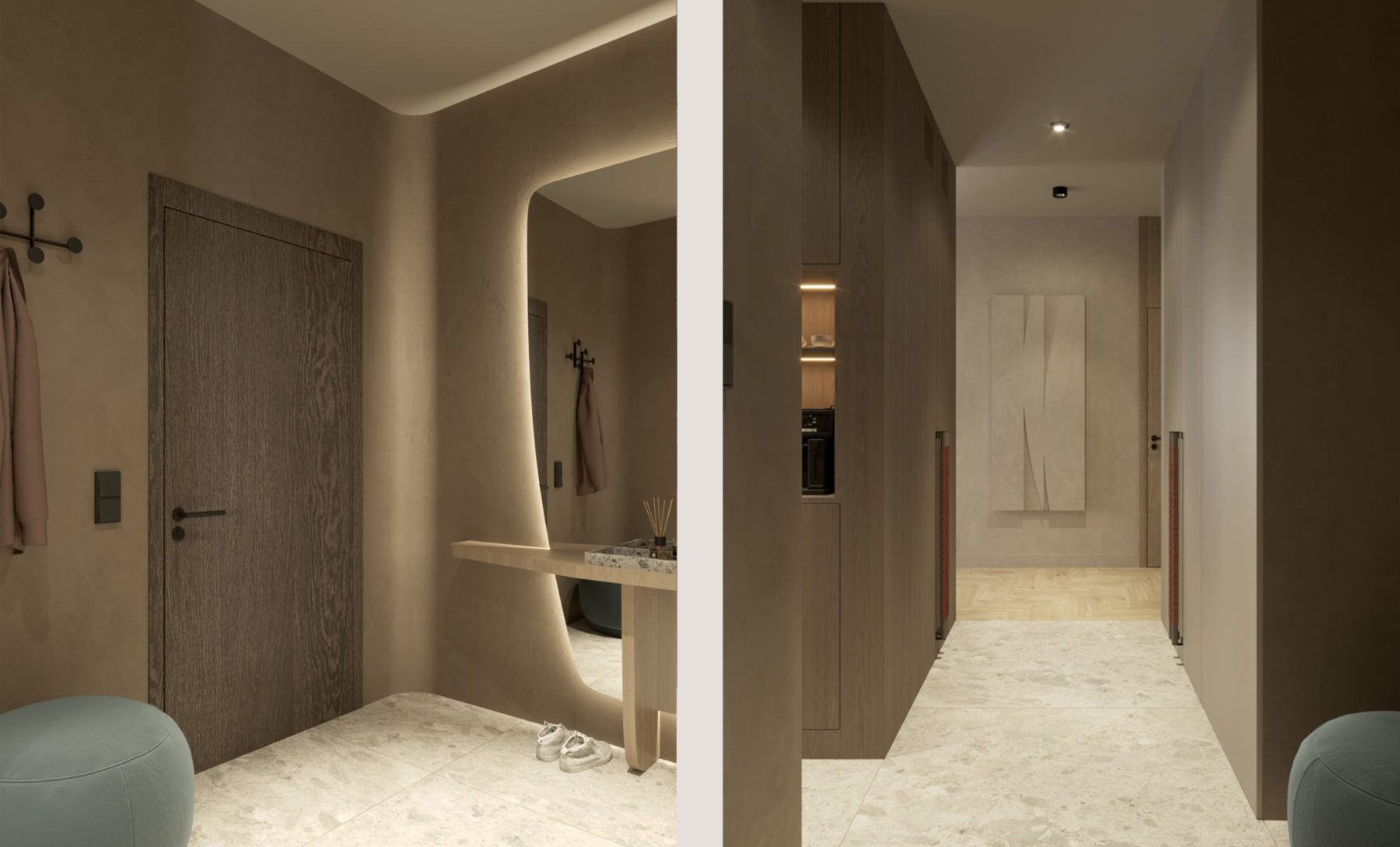 Istotną rolę odgrywają dopracowane proporcje i miękkie detale architektoniczne, które nadają wnętrzu lekkości i subtelnie przełamują geometryczną formę. Zabudowy meblowe zostały wkomponowane w architekturę, tworząc jednolite, uporządkowane płaszczyzny i podkreślając minimalistyczny charakter aranżacji.