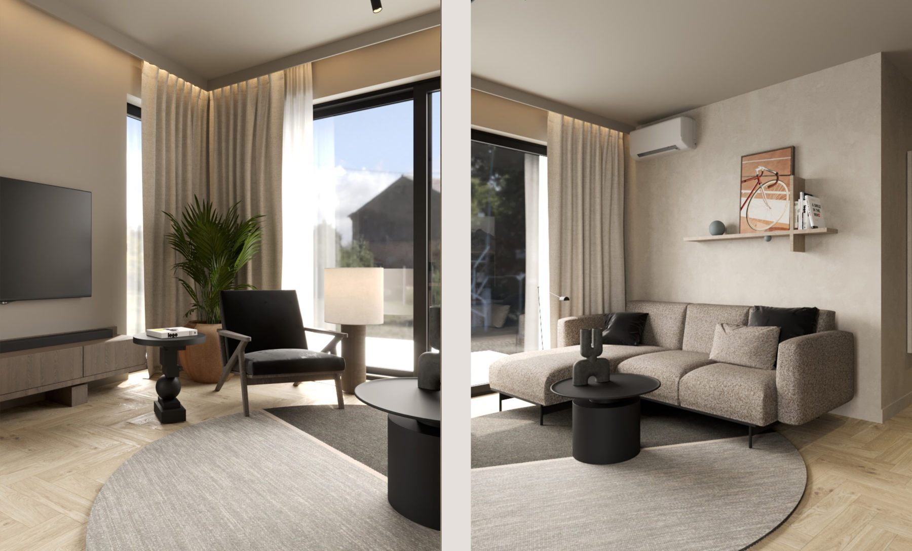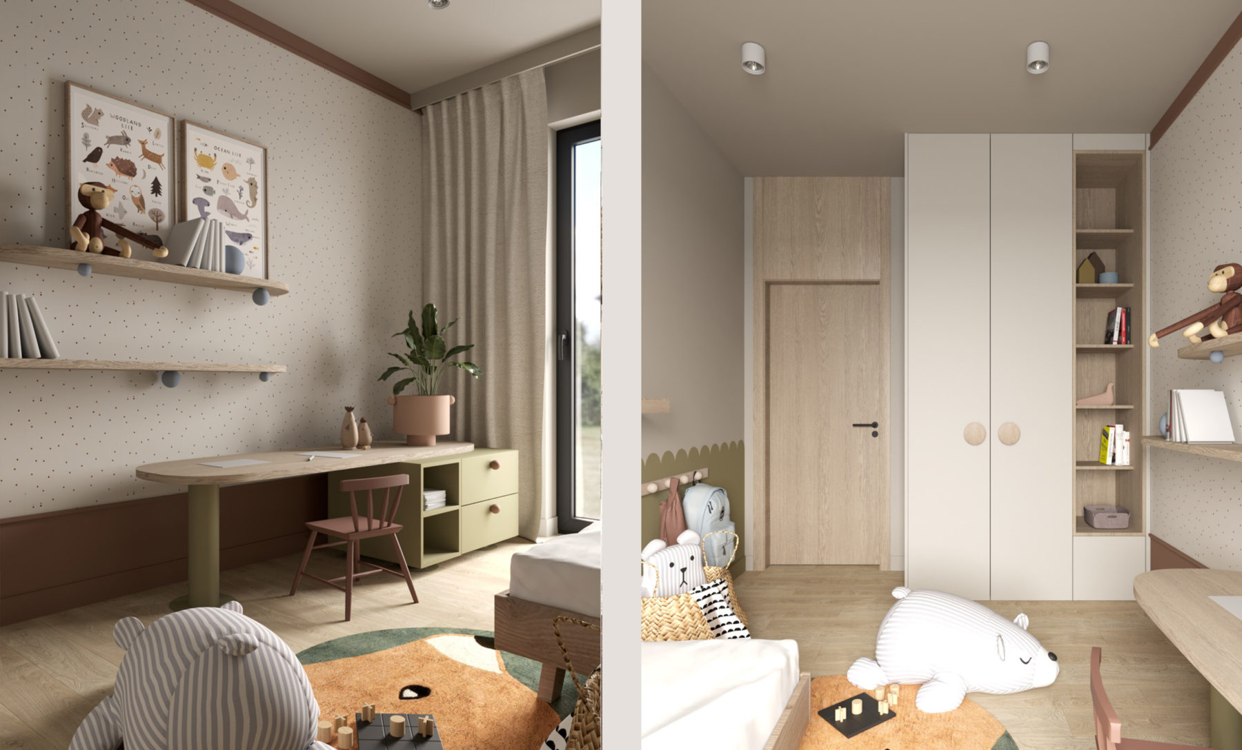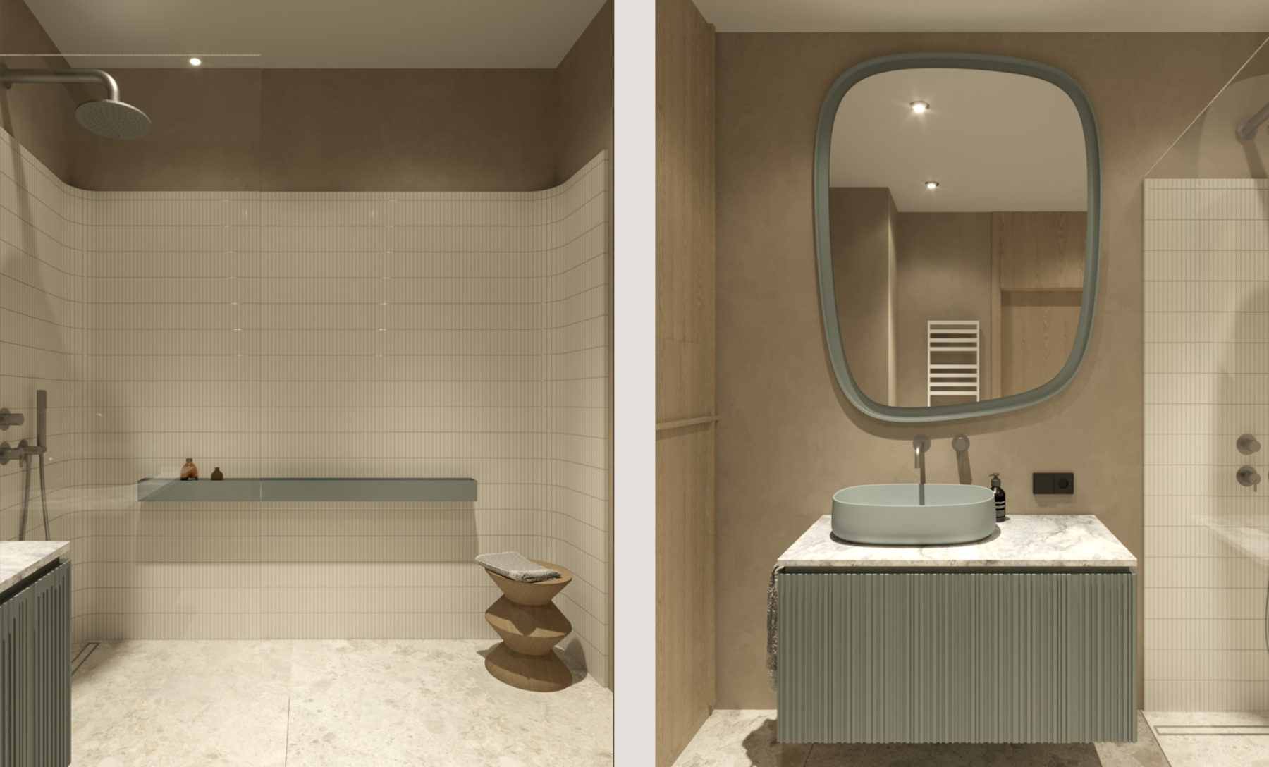 Projekt wnętrza oparty jest na nowoczesnej prostocie i spójnej, stonowanej estetyce. Paleta ciepłych beży, jasnego drewna oraz naturalnych odcieni kamienia tworzy harmonijną, spokojną przestrzeń sprzyjającą codziennemu komfortowi. Całość została zaprojektowana w sposób ponadczasowy, bez zbędnych kontrastów i dekoracyjnego nadmiaru.